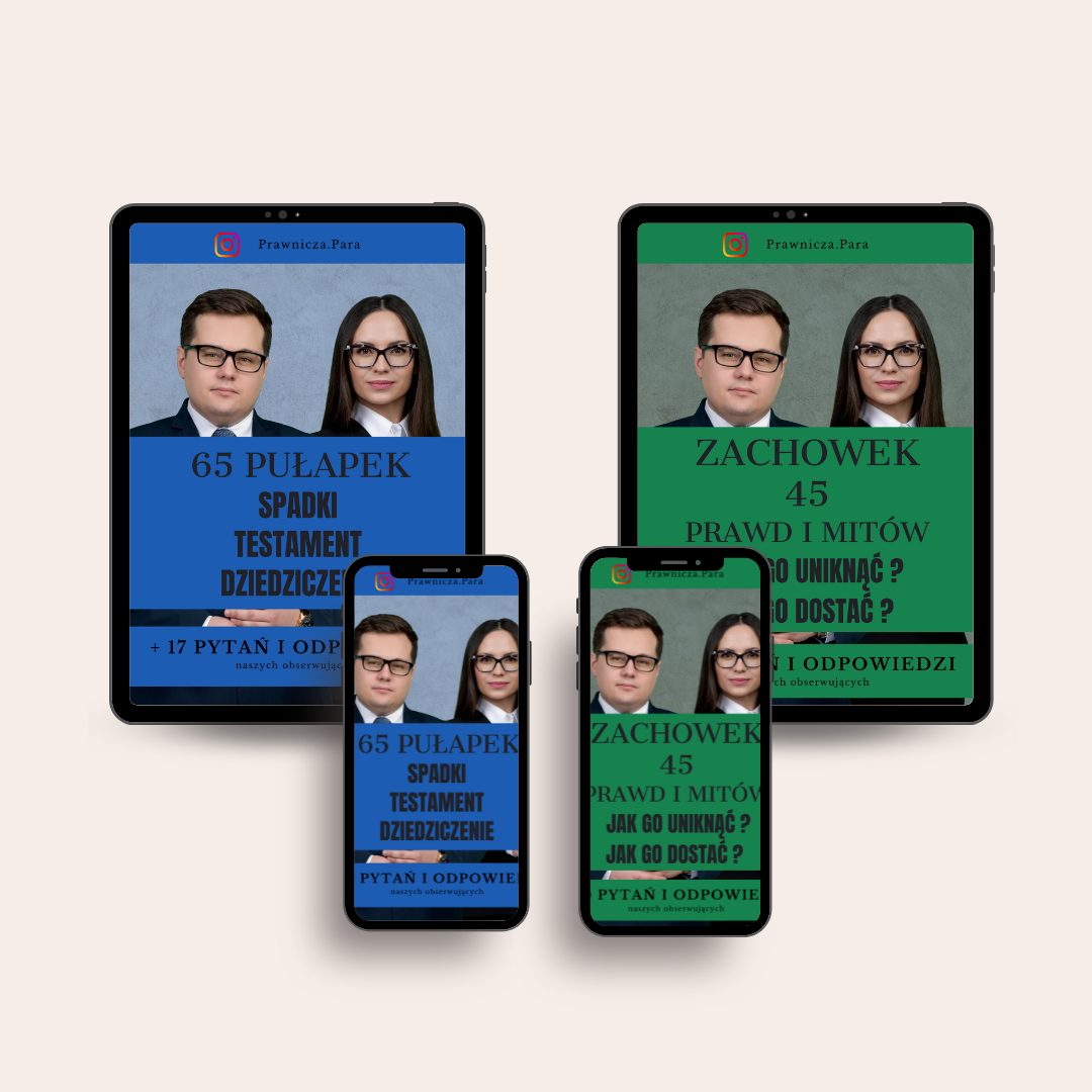 Osoba, która zakupiła naszego dowolnego ebooka ma zniżkę na KONSULTACJĘ PRAWNĄ ONLINE z jednym z nas. Wysokość zniżki różni się w zależności od uruchamianych zapisów. Aktualnie jest to zniżka o około 90 złotych.